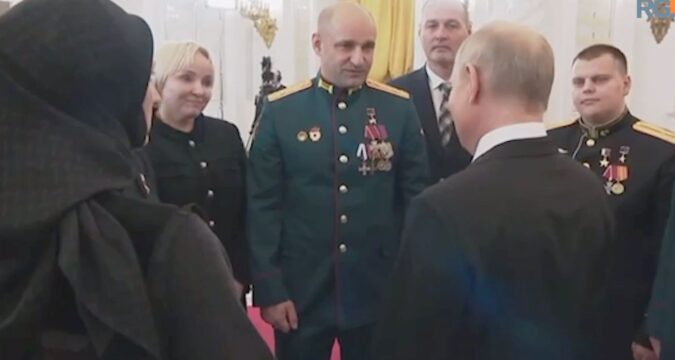 После завершения церемонии к главе государства обратился Артем Жога -отец Героя России, Героя ДНР Владимира Жоги. Путин сразу его заметил и попросил подойти поближе. Вместе с Жогой к главе государства подошли и некоторые другие приглашенные гости – начальник управления по работе с регионами “Защитники Отечества”, мать погибшего Героя России Андрея Ковтуна Мария Костюк, директор одной из школ Махачкалы, мать погибшего Героя России Нурмагомеда Гаджимагомедова Сапижат Мазаева, главврач Московской городской клинической больницы 52, Герой Труда Марьяна Лысенко, заместитель гендиректора ПАО “ОДК-Сатурн”, Герой Труда Виктор Поляков, шахтер, Герой Труда Эдуард Щербина, а также награжденные на церемонии военнослужащие – старший лейтенант Эдуард Казымов, сержант Юрий Мизерный и старший сержант Дмитрий Пьянков.