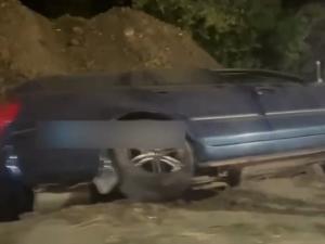 Машина завалилась на бок, упав в вырытую яму у обочины.