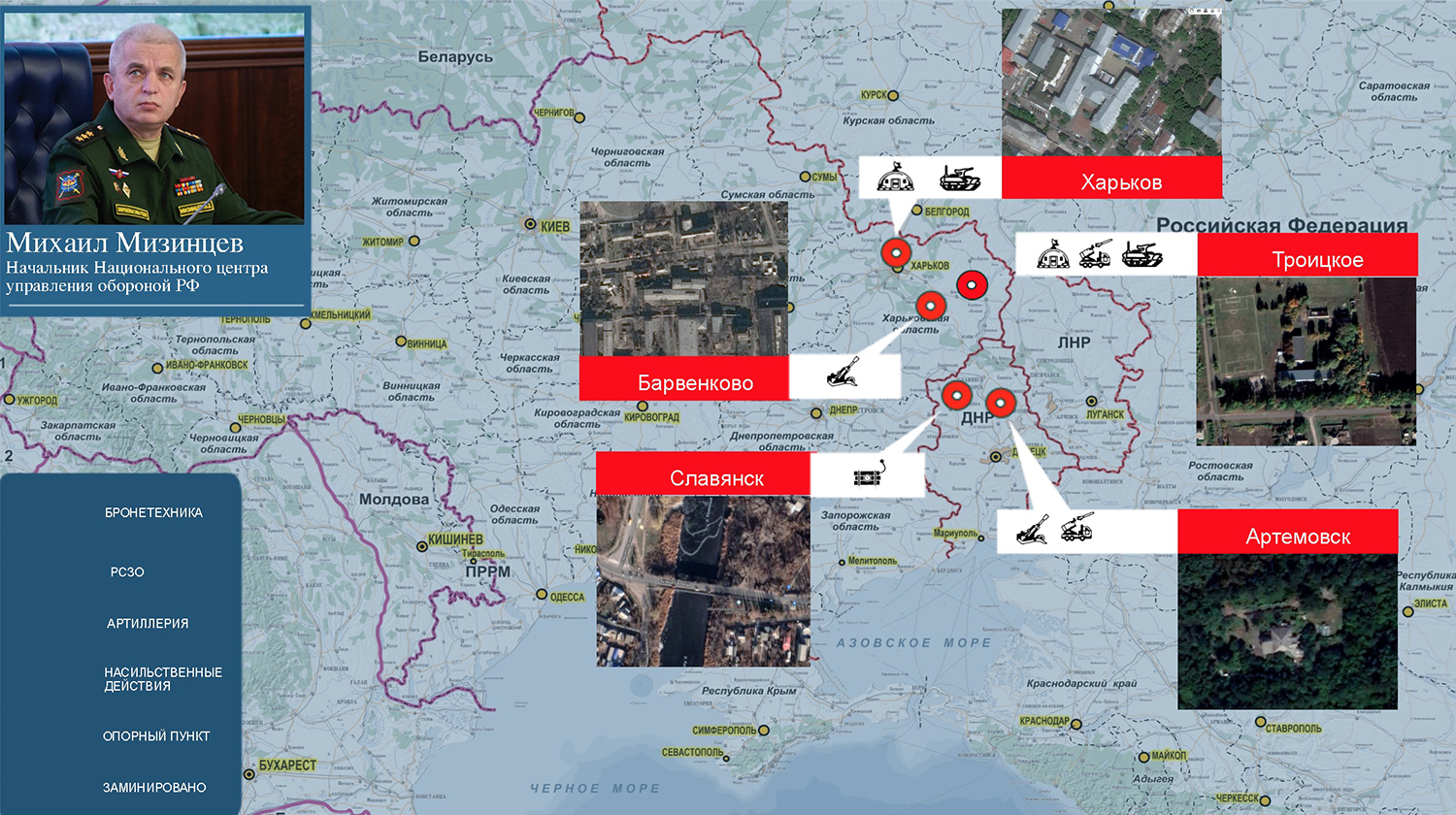 Конашенков также сообщил, что в результате ударов по позициям украинской 72-й механизированной бригады в районе Зайцево, 112-й бригады территориальной обороны под Артемовском и 101-й бригады территориальной обороны около Яковлевки в Донецкой Народной Республике уничтожено до 100 националистов, два танка и 15 автомобилей.