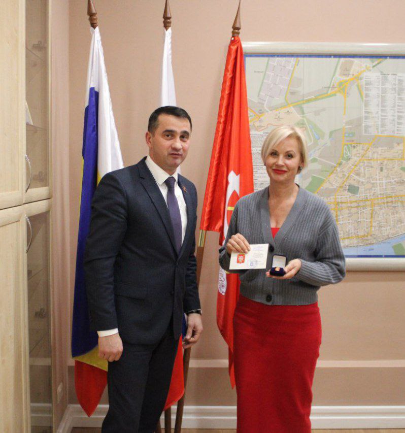 На Собрании глава администрации города Аксая Евгений Николаевич Камфарин вручил депутатам памятный знак «За развитие города Аксай».