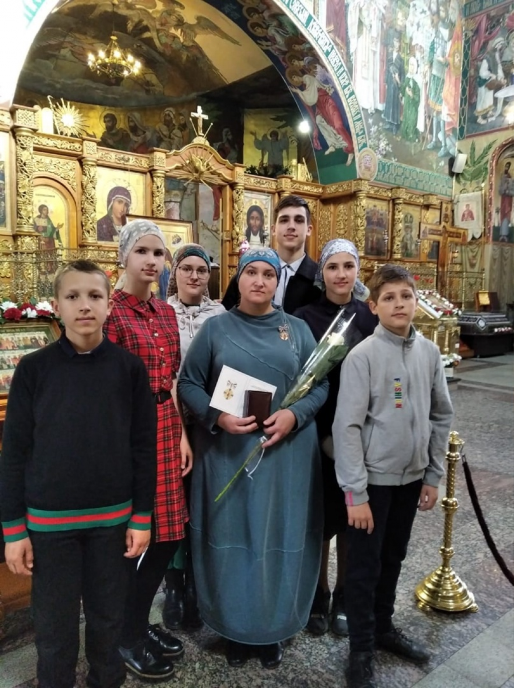 Патриаршим знаком материнства 1 степени удостоена многодетная мама Ольга Николаевна Краснова (см. фото), супруга настоятеля Свято-Никольского храма в х. Старая Станица Михаила Краснова. Батюшка с матушкой воспитывают 13 детей.