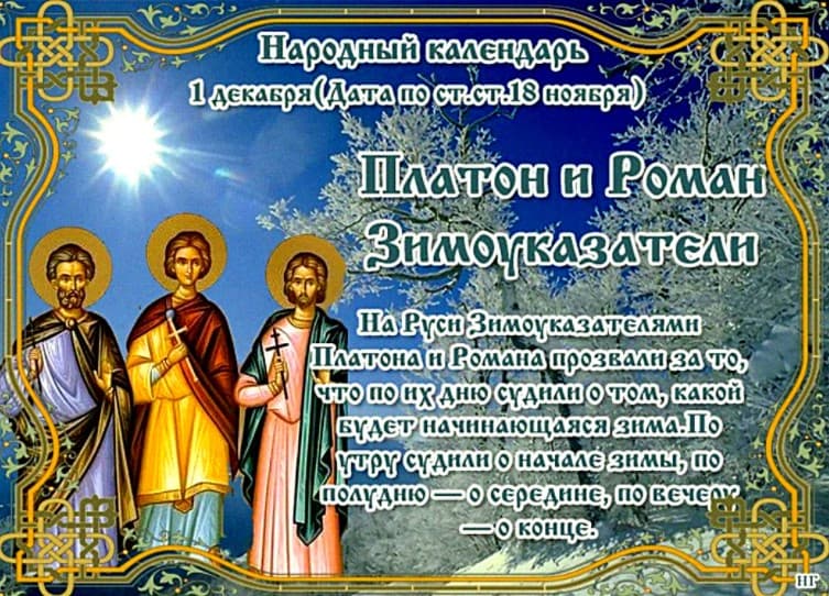 Платон и Роман Зимоуказатели: приметы дня1 декабря наши предки считали показателем всей зимы. Существовала поговорка у крестьян: « Платон и Роман покажут зиму вам». В этот день внимательно следили за погодными явлениями и по народным приметам предсказывали, какой будет наступившая зима:
