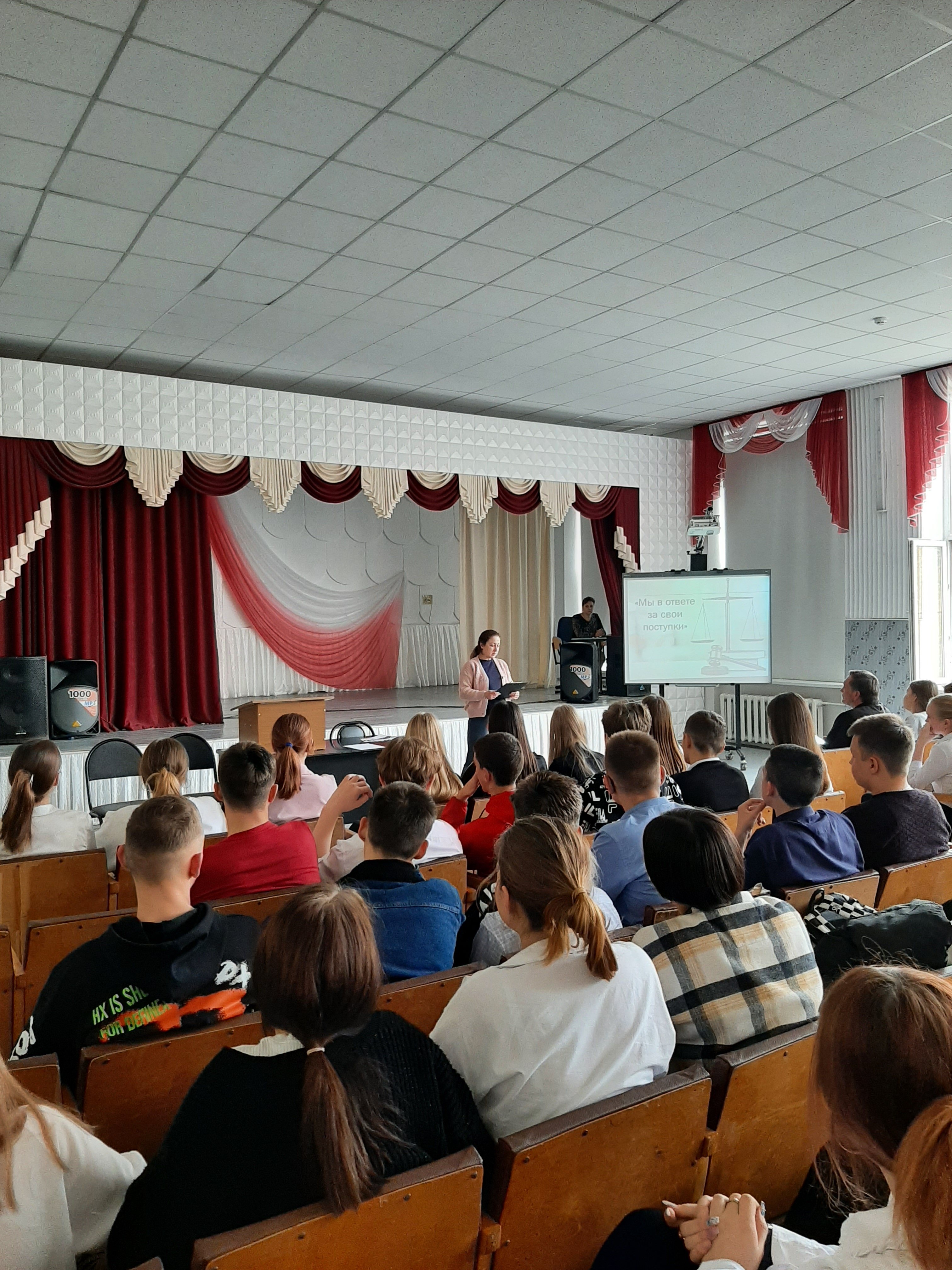 Ведущая рассказала о четырех видах юридической ответственности за правонарушения:уголовную, административную, дисциплинарную, гражданско-правовую. Поговорили о таких понятиях, как закон, проступок, правонарушение, преступление, о том, что тысячи подростков попадают в трудную ситуацию совершая необдуманные поступки.