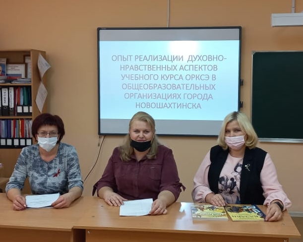 Марина Викторовна Лукьянченко, Алла Владимировна Ковалева и Жанна Алексеевна Дёмина подготовили выступления по теме «Опыт реализации духовно-нравственных аспектов учебного курса «ОРКСЭ» в общеобразовательных организациях города Новошахтинска».