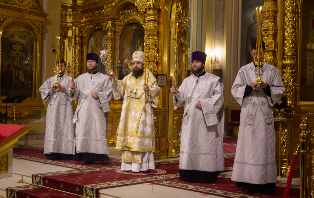 Его Преосвященству сослужили настоятель собора иерей Леонтий Дмитриев, духовник епархии протоиерей Николай Урывский, епархиальный древлехранитель иеромонах Маврикий (Звягинцев), клирики собора.