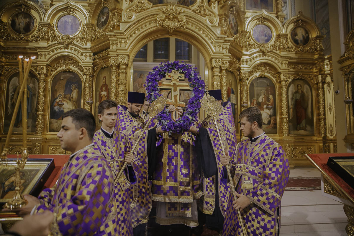 Во время совершения всенощного бдения Крест Господень был обнесен по соборному храму, после чего владыка митрополит в сослужении духовенства совершил чин Воздвижения Честного и Животворящего Креста Господня.