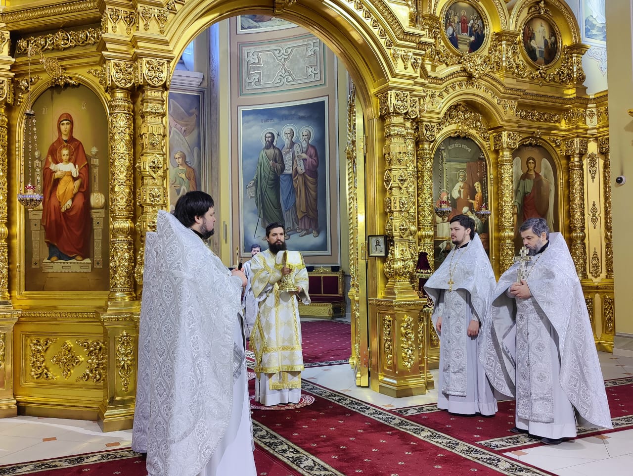 Его Преосвященству сослужили настоятель собора иерей Леонтий Дмитриев и клирики собора. Диаконский чин возглавил диакон Сергий Осяк.