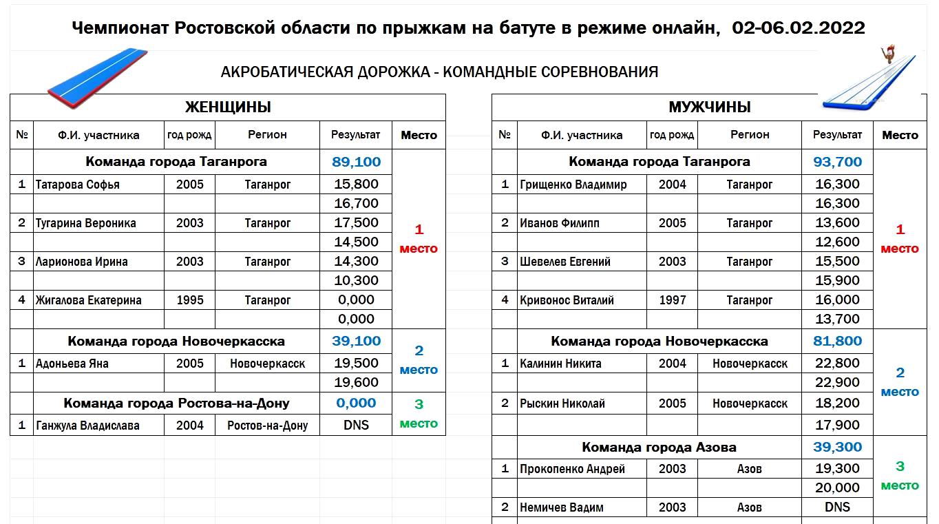 Командный чемпионат Ростовской области завершился выступлением спортсменов в прыжках на акробатической дорожке. 1 место и у мужчин, и у женщин заняла сборная команда города Таганрога в составе: Тугарина Вероника, Татарова Софья, Ларионова Ирина, Виталий Кривонос, Владимир Грищенко, Евгений Шевелев и Филипп Иванов! На 2 месте сборная команда города Новочеркасска в составе: Адоньева Яна, Калинин Никита и Николай Рыскин! На 3 месте спортсмен из команды города Азова Андрей Прокопенко!