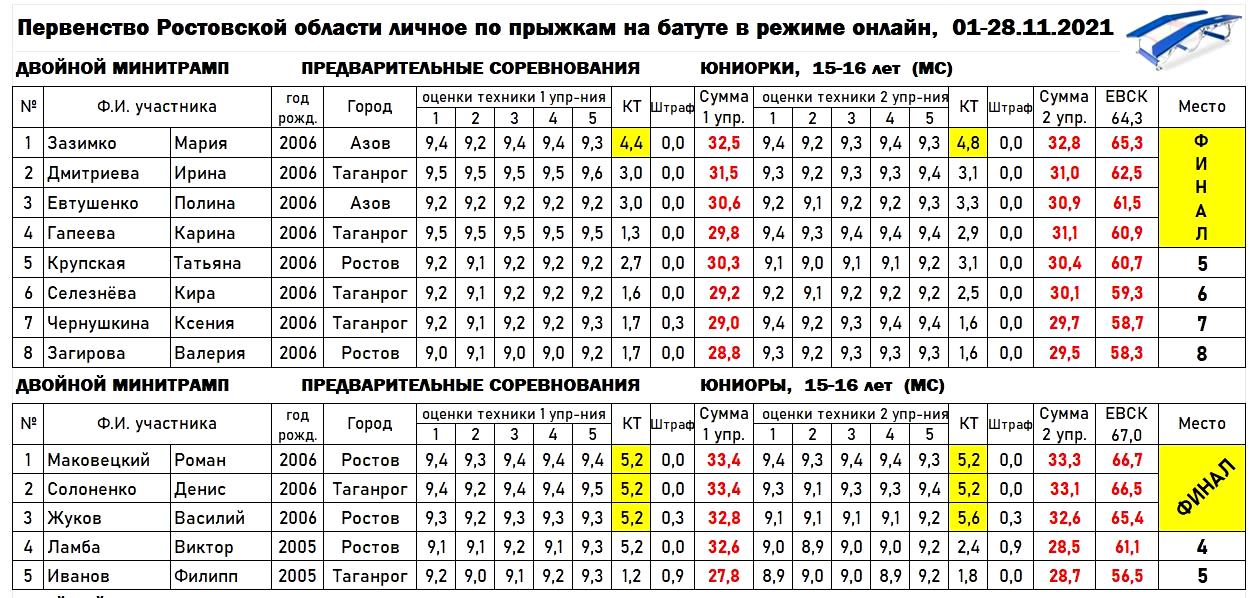 ДВОЙНОЙ МИНИТРАМП. ИТОГИ КВАЛИФИКАЦИИ ПЕРВЕНСТВА РОСТОВСКОЙ ОБЛАСТИ (9-10, 11-12, 13-14 и 15-16 лет)