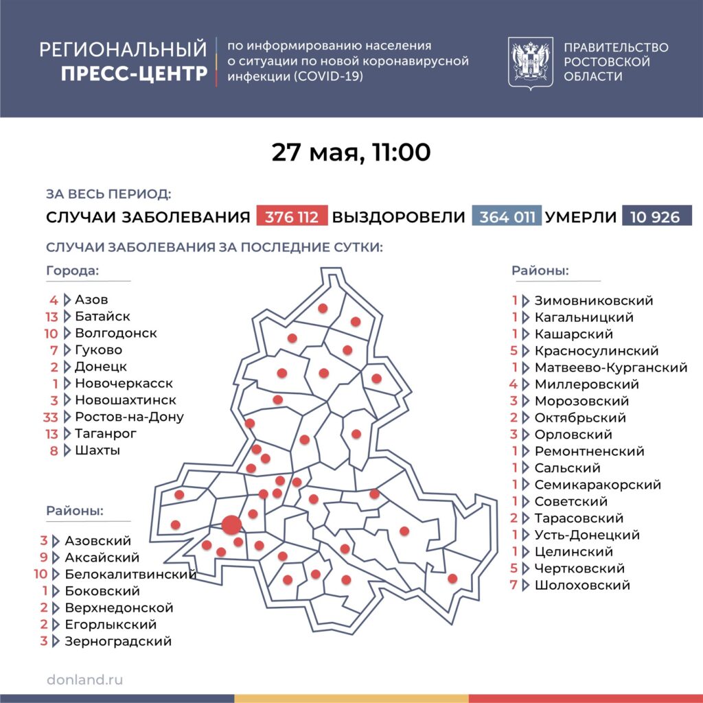 Новые инфицированные зарегистрированы в 35 городах и районах региона: в Ростове-на-Дону (33), Батайске (13), Таганроге (13), Волгодонске (10), Белокалитвинском (10), Аксайском (9) районах, Шахтах (8), Гукове (7), Шолоховском (7), Красносулинском (5), Чертковском (5) районах, Азове (4), Миллеровском (4) районе, Новошахтинске (3), Азовском (3), Зерноградском (3), Морозовском (3), Орловском (3) районах, Донецке (2), Верхнедонском (2), Егорлыкском (2), Октябрьском (2), Тарасовском (2), Новочеркасске (1), Боковском (1), Зимовниковском (1), Кагальницком (1), Кашарском (1), Матвеево-Курганском (1), Ремонтненском (1), Сальском (1), Семикаракорском (1), Советском (1), Усть-Донецком (1), Целинском (1) районах.